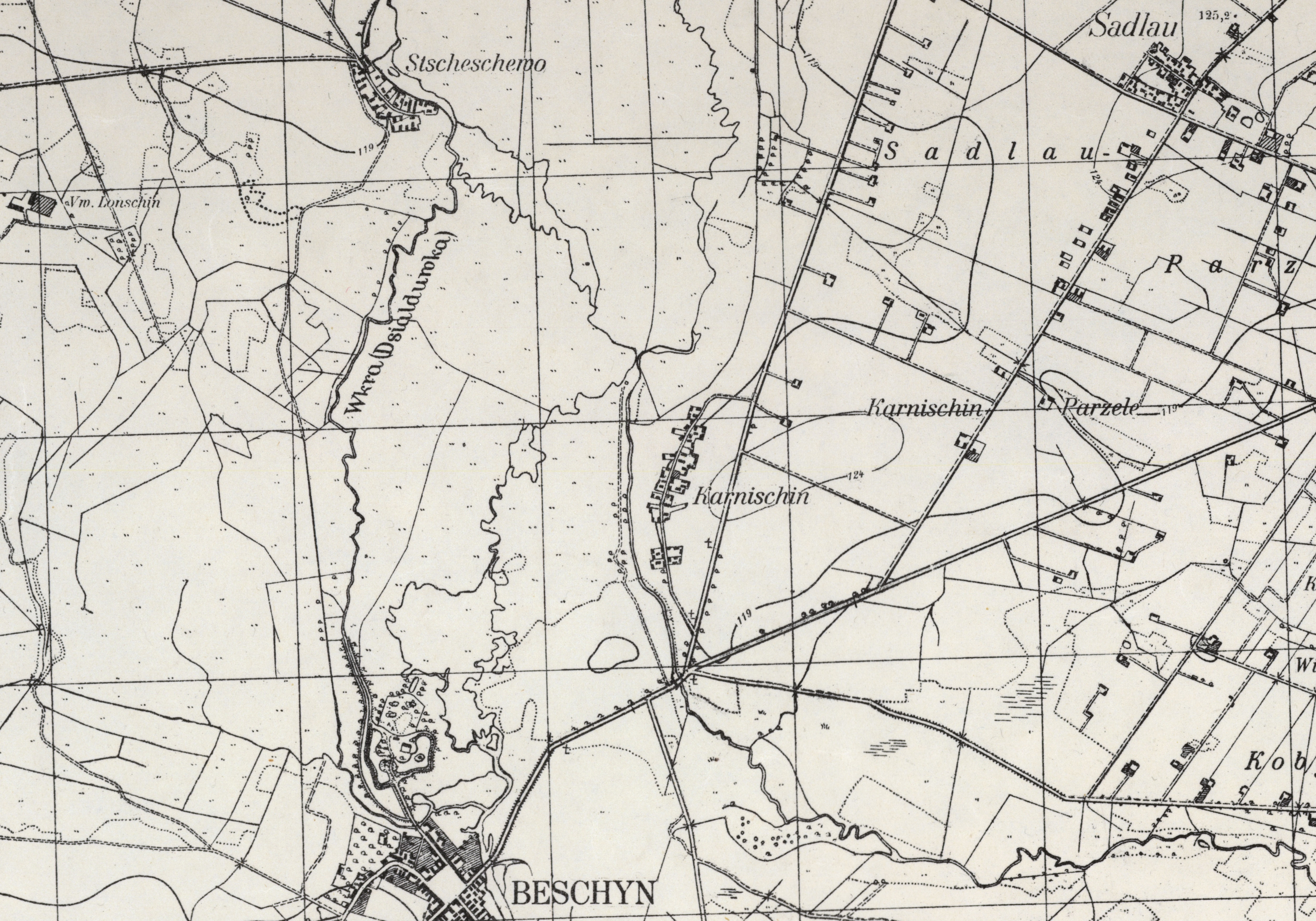 1900 r. (jest już na mapie) i stanowi symboliczną granicę wsi, do