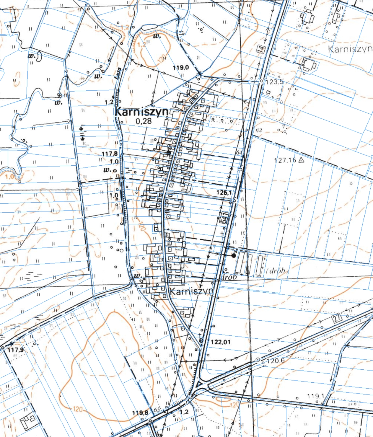 Archiwalna ikonografia Karniszyna obrazuje ulicowy charakter miejscowości położonej równolegle do głównego traktu z poszerzonym wrzecionowato światłem drogi głównej.