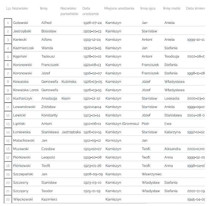 Baza danych obejmuje 22 osoby urodzone w Karniszynie, które ucierpiały w trakcie II wojny światowej, niestety nie obejmuje osób, którym w kwestionariuszach do bazy podano jako miejsce urodzenia gminę Bieżuń a nie miejscowość rodzinną (lista osób urodzonych w Bieżuniu liczy aż 316 osób i zawiera także tych którzy urodzili się w Karniszynie):